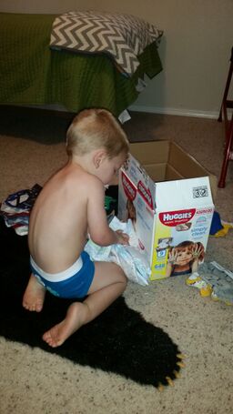 Next, we took a box and put all the diapers we had in the house in it. I told him we needed to take them to his new baby cousin, Ryann. She needed them because she was a baby and Colson was a big boy. He helped me do all of it. I was really excited and made it fun!